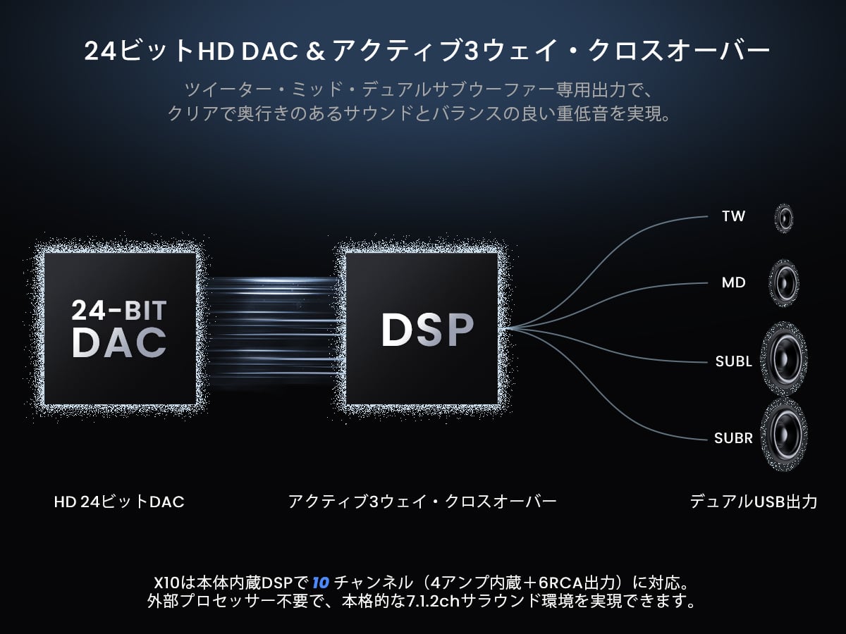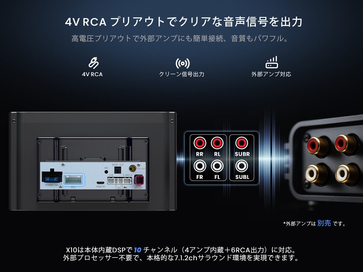 •進化したオーディオ体験:DSP 36バンドEQ・タイムアライメント・3wayクロスオーバー・HD 24bit DAC搭載。光デジタル出力&10ch自由アサインでツイーターやサブウーファーも思い通り。追加アンプ不要で、愛車がコンサートホールに