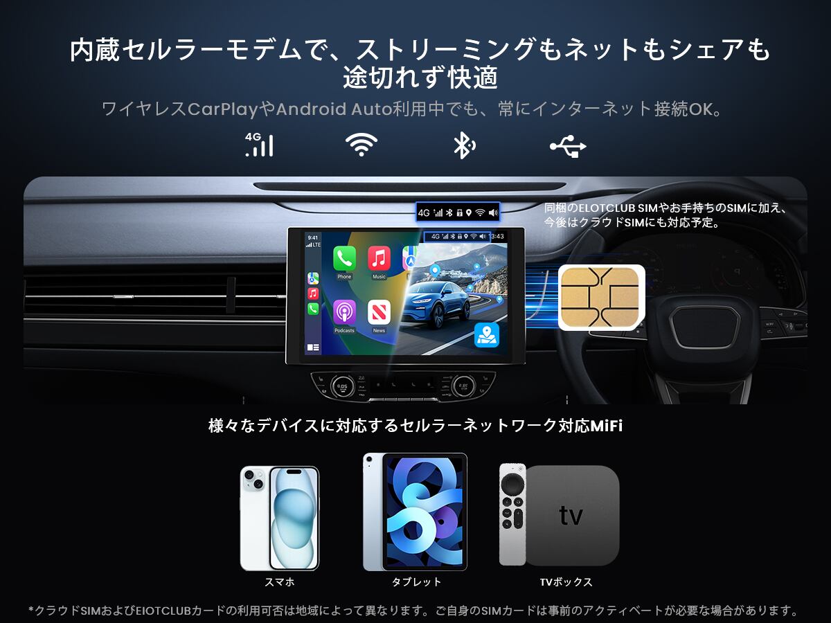 • いつでもつながる安定ネット環境:4Gセルラー通信とデュアルバンドWi-Fi対応で、移動中でも安定した音楽ストリーミング、地図更新、アプリ追加が可能。内蔵ホットスポットで同乗者も快適ネット接続。Google PlayとFindappsでエンタメは無限大