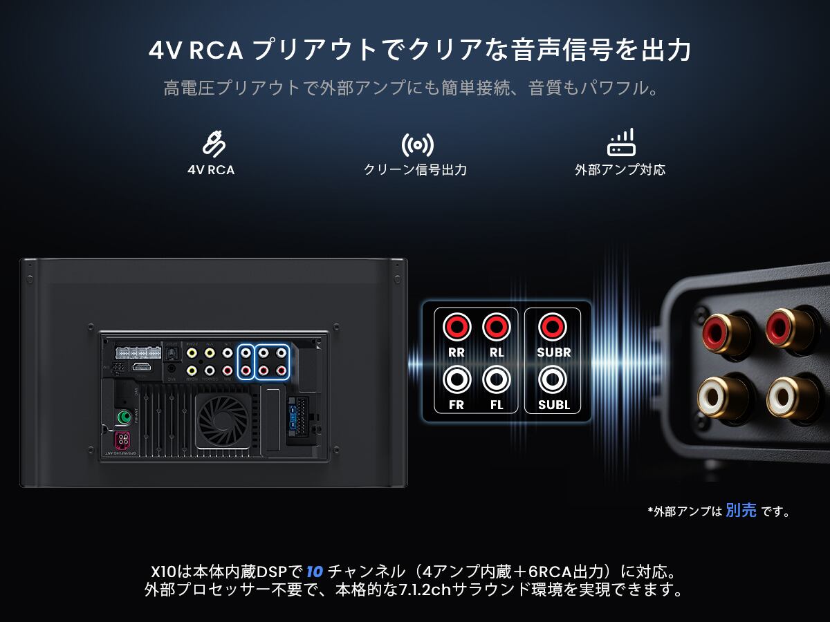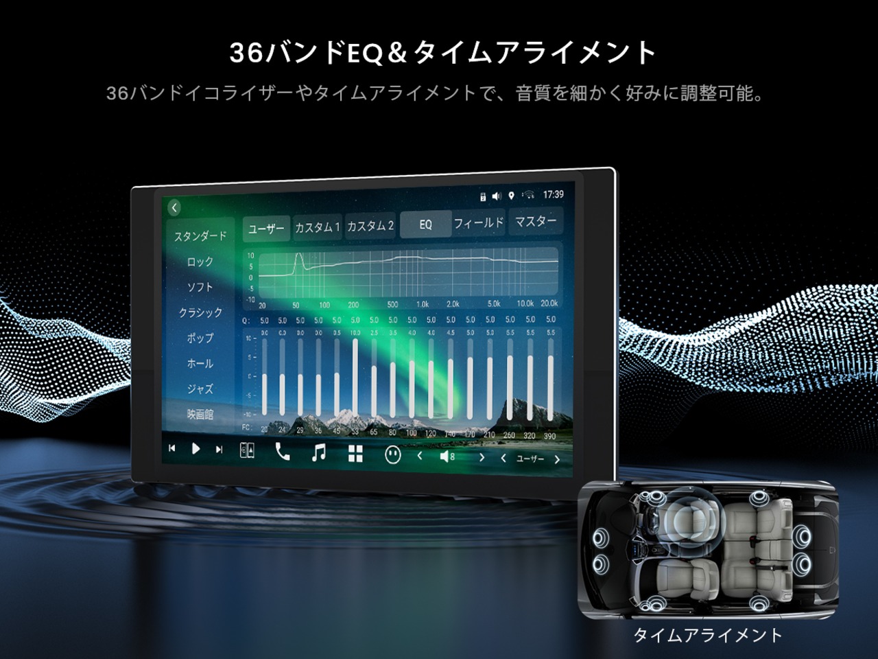 • 音にこだわる車内空間へ:36バンドEQ、タイムアライメント、3ウェイ・クロスオーバー機能、HD 24ビットDACを搭載。光デジタル出力と10ch自由設定が可能な音響システムにより、スピーカーやサブウーファーを自在に駆動。車内をまるでコンサートホールのような臨場感ある7.1.2chサウンド空間に変えます