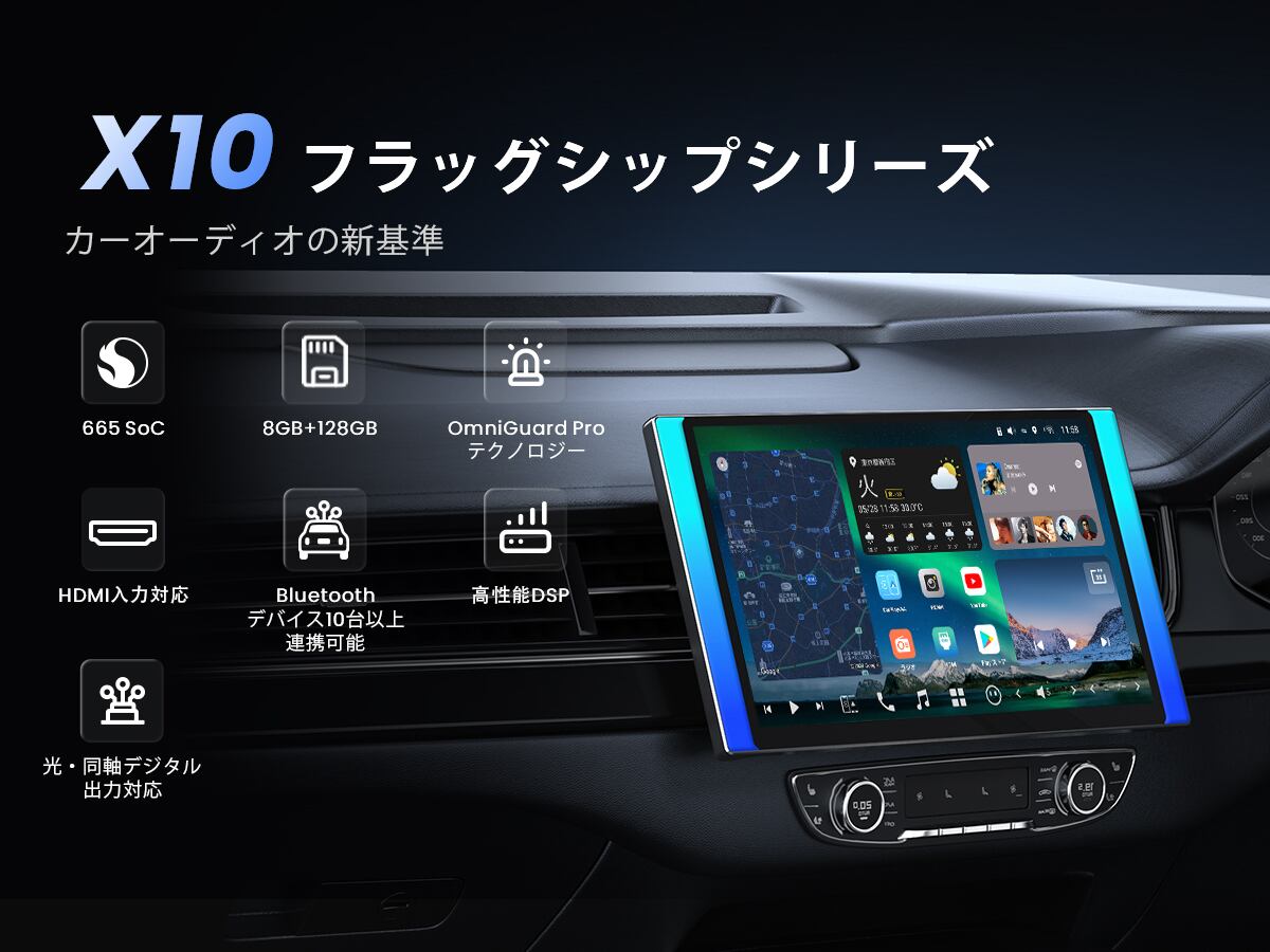 1.全新のAndroid 13と独自UI「AICE 13」を搭載。X10G225EはAndroid 13ベースの独自UI「AICE 13」を採用。定期的なOTAファームウェア更新に対応し、ウィジェットの自由なカスタマイズや幅広いアプリ互換性を実現しています。ナビアプリやお気に入りのストリーミングアプリへの切り替えも、ホーム画面からワンタップで行えます。//2.高性能プロセッサ&大容量メモリ:X10G225EはQualcomm製の高性能8コアCPU(QCM6125)を搭載。8GBのRAMと128GBの大容量ストレージにより、アプリやナビ操作がサクサク快適。スムーズな動作でストレスのない運転をサポートします。//3.2つのカメラ入力を装備し、前後または車内をフルHD(1080P)で同時録画可能。駐車時監視、緊急録画、GPSを利用した再生機能を備え、さらに今後のOTAアップデートでAIを活用した運転支援や車内監視機能も提供予定です。カメラの付属有無は選択するモデルによって異なります。//4.本格的なオーディオDSP搭載。36バンドイコライザー、タイムアライメント、3ウェイクロスオーバー機能で高音質を実現。24bit DACによる高解像度サウンドに加え、SPDIF出力で外部アンプやDACとの接続も可能。簡単に設定調整やリセットが行えます。//5.4V RCAプリアウトでクリアな音声信号:高電圧4V RCAプリアウトにより外部アンプと簡単に接続でき、高音質でパワフルかつクリアなサウンドを実現。//6.車内をネットワークでつなぐセルラーモジュール内蔵。ナビや動画ストリーミング、IoT管理までシームレスに利用可能です。内蔵のBLEモジュールにより、OBDアダプターやLEDライトシステムなどのBluetoothデバイスを手軽に管理でき、愛車をスマート化します。//7.QLEDディスプレイ:12.5 インチ1920×1200の画面は550ニットの明るさと反射防止で、直射日光下でも鮮明で見やすい表示を実現。