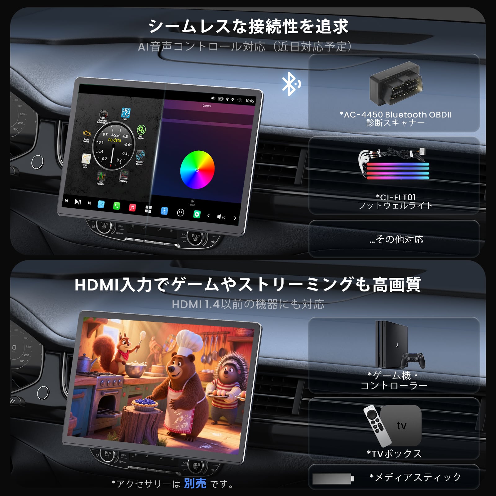 スマホとワイヤレスに繋げることで使い慣れたアプリを大画面ディスプレイに表示。電話、音楽再生、ルート検索、メッセージの送受信などをタップ操作や音声操作で快適に使えます。ケーブルが不要なため、移動中や外出先での利用が非常に便利です。