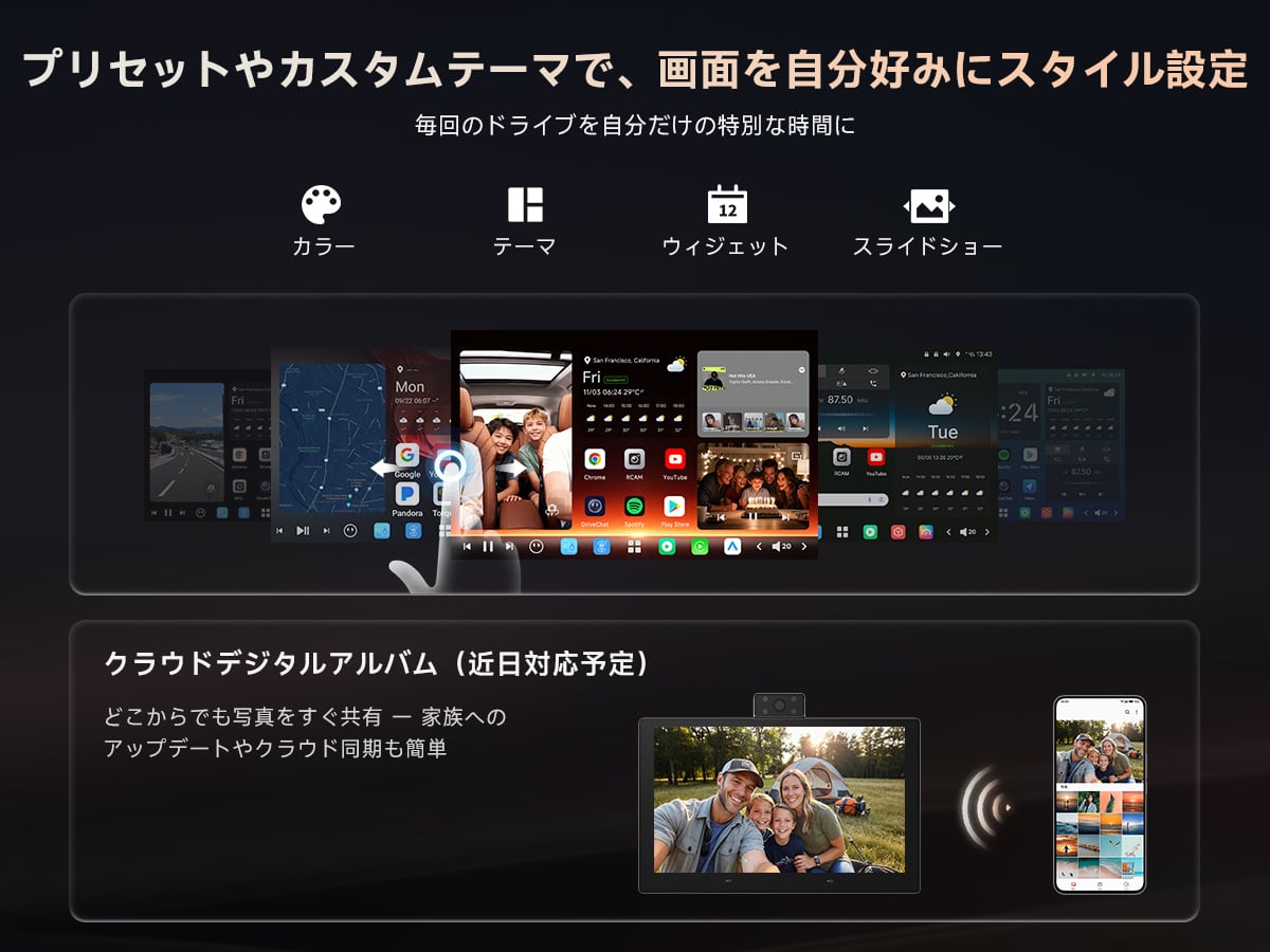 自由にカスタマイズできるパーソナルUI テーマ・ウィジェット・スライドショー・背景カラーなどを自由に設定可能。車の雰囲気や気分に合わせてホーム画面を自分好みにデザイン。よく使うアプリのショートカットも簡単に配置できます。