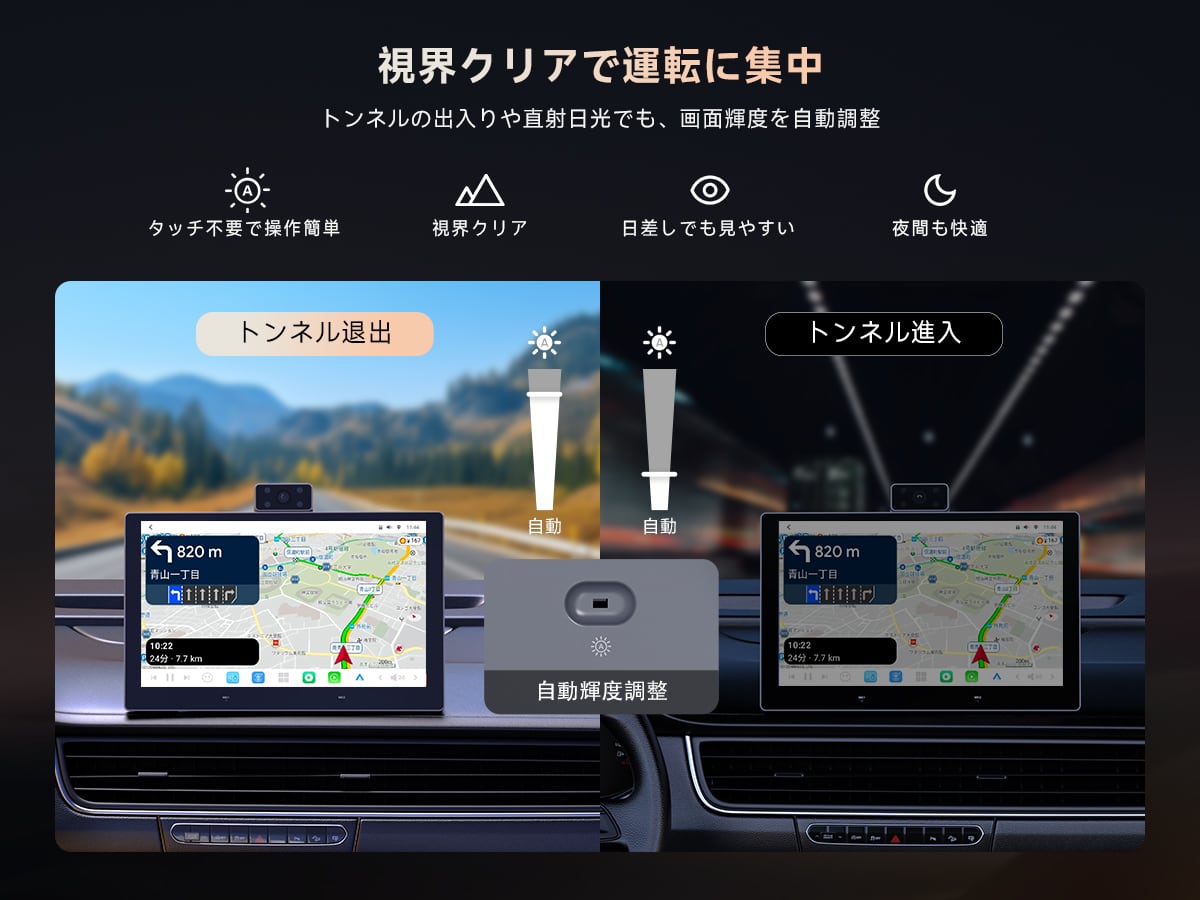 インテリジェント自動輝度調整 内蔵ライトセンサーが周囲の明るさをリアルタイム検知。トンネル出口や直射日光などの急激な明暗変化にも瞬時に対応し、画面のまぶしさを抑えてナビ表示を常にクリアに保ち、目の疲労を大幅に軽減します。
