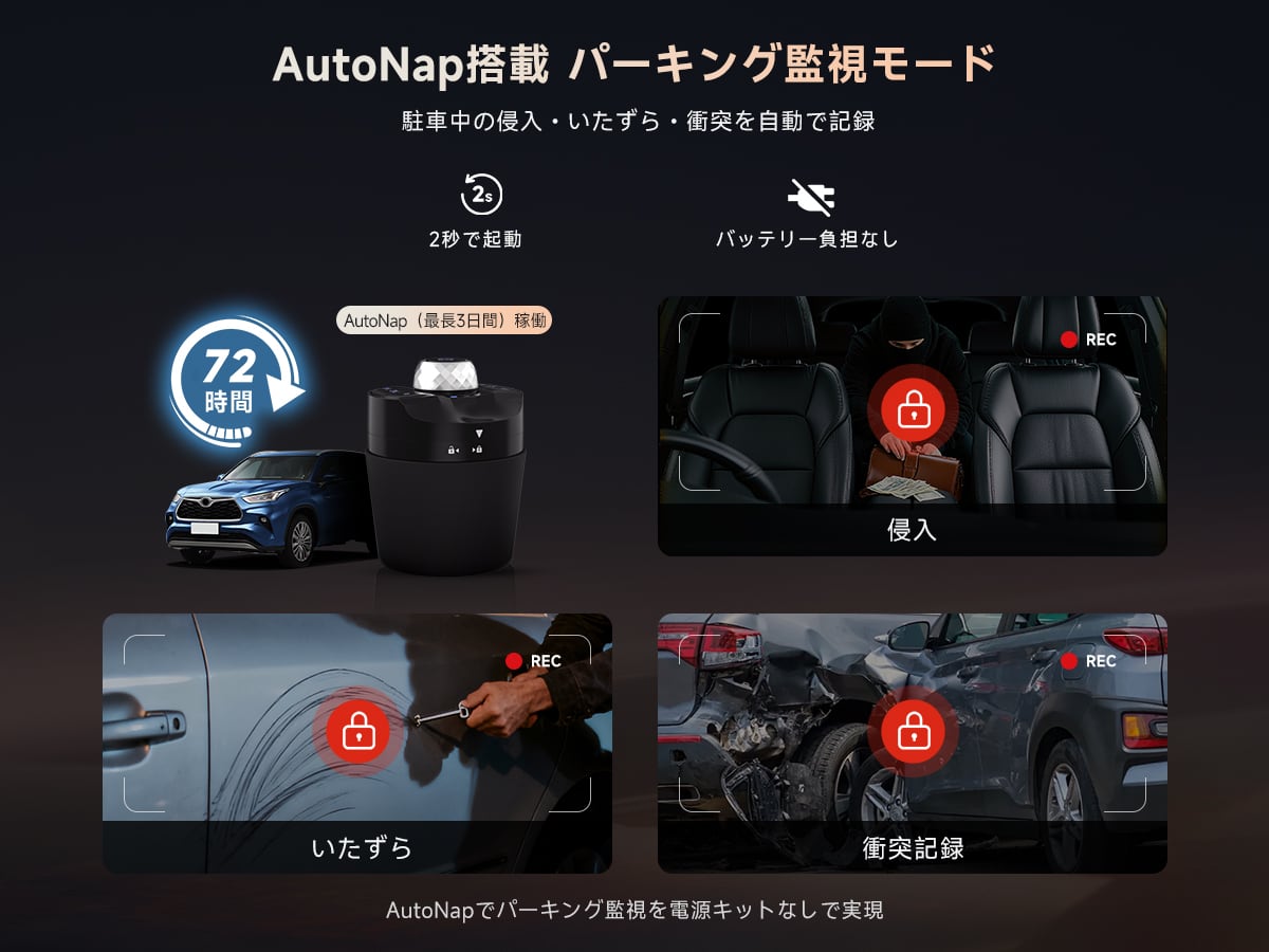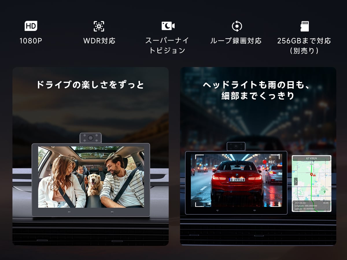 TwinSight 前方&車内デュアル1080P高画質録画 前方道路のナンバープレートから車内の様子まで鮮明記録。夜間撮影・WDR・低照度補正対応で、子供やペットの安全確認も安心。駐車時もバッテリー保護しながら重要な映像を確実に保存します。