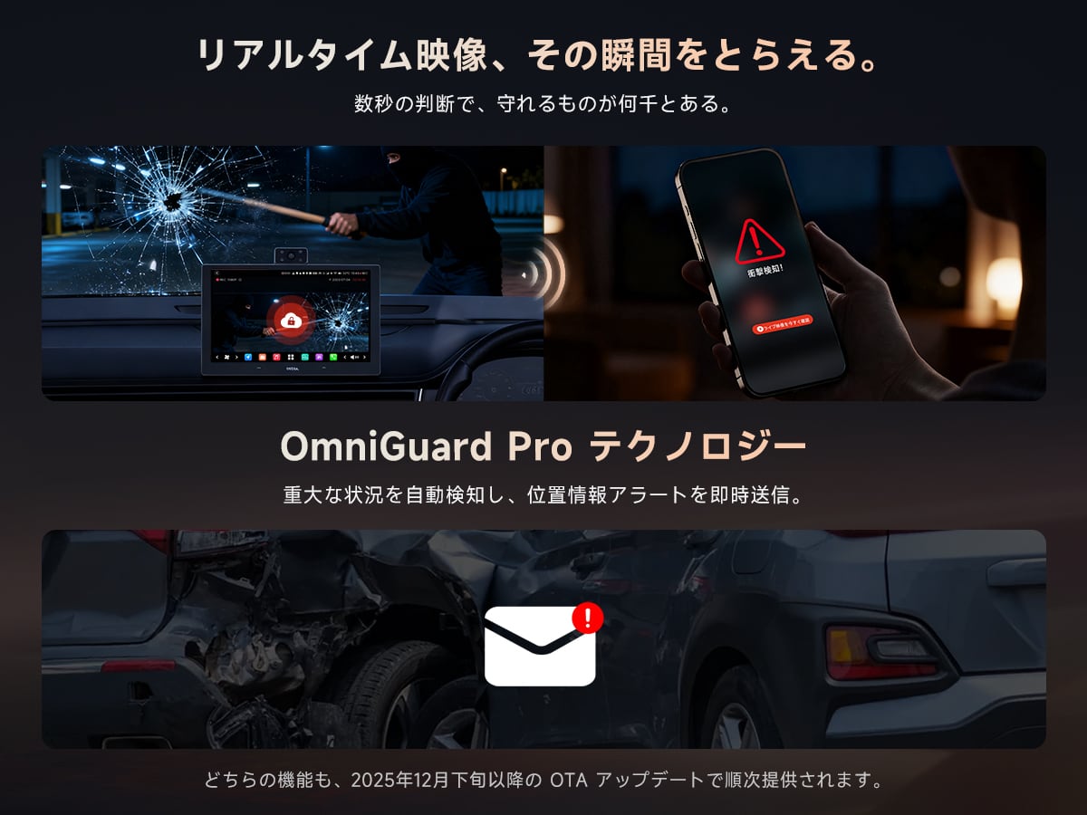 駐車監視&リアルタイムライブビュー Gセンサーで衝撃を検知すると自動録画・ロックし、クラウドへ即アップロード。専用アプリから前方カメラ&車内カメラの映像をいつでもライブ確認可能。当て逃げ・盗難・駐車場トラブルもその場でチェックでき、確実な証拠を残せます。