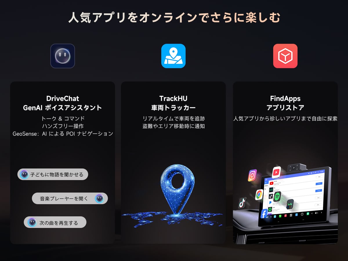 DriveChat AIドライブパートナー 音声操作でハンズフリー着信応答、音楽再生、BLEアクセサリー管理、アプリ起動まで対応。画面に触れず視線を前方に保った安全運転をサポートします。雑談や天気予報も教えてくれるので、長距離ドライブがより楽しく快適に。